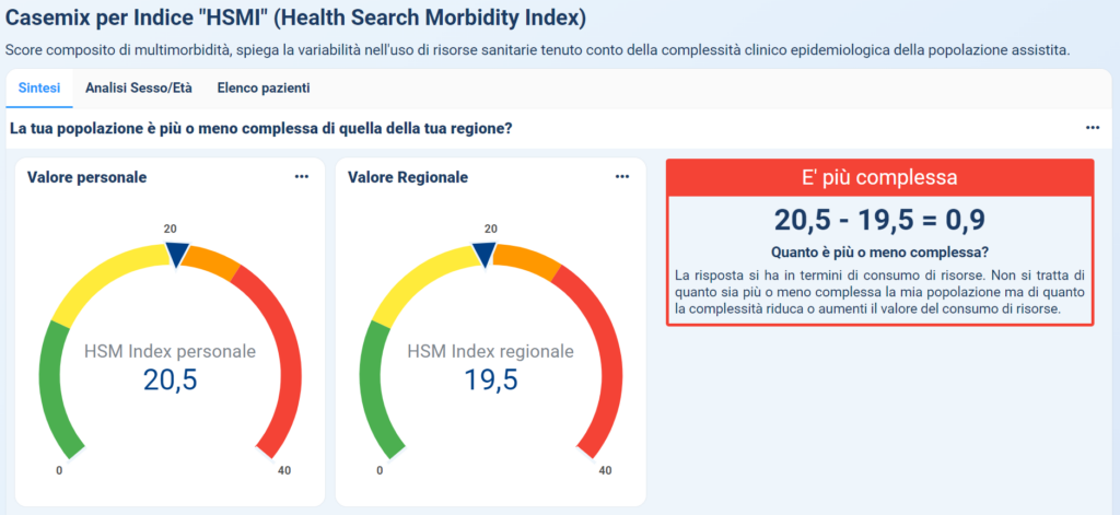 Per esempio se l’HSM Index medio della propria popolazione è più alto (con effetti progressivi) rispetto a quello calcolato in HS (valore medio di complessità clinica stimato per la tua regione), questo indica che la complessità clinico-epidemiologica dei propri assistiti potrebbe giustificare proporzionalmente una spesa sanitaria generata maggiore. Discorso naturalmente opposto per punteggi medi personali (HSM index) più bassi.