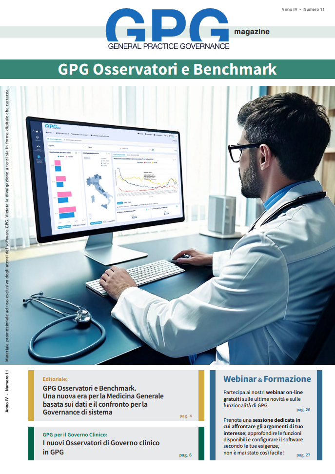 Il numero 11 di GPG Magazine (2024), intitolato “GPG Osservatori e Benchmark: Una nuova era per la Medicina Generale basata sui dati”, si focalizza sulla presentazione del nuovo modulo di governance e benchmarking per i Medici di Medicina Generale (MMG).